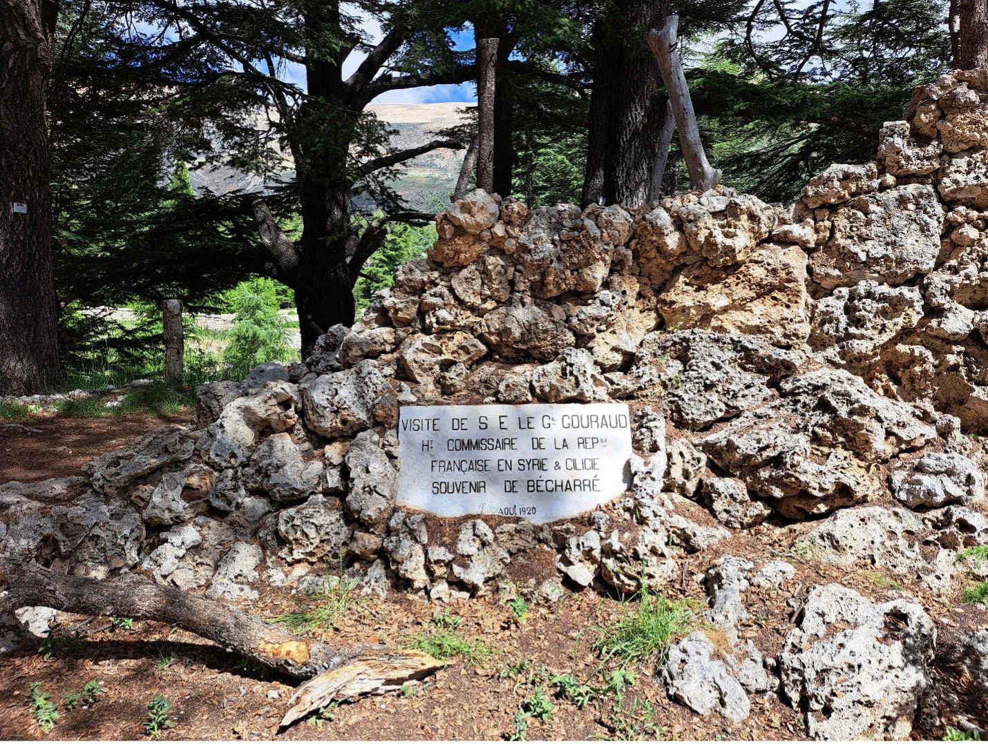 A sign under a cedar tree stands as a souvenir of the visit of the French High Commissioner General Henri Gouraud in August 1920
