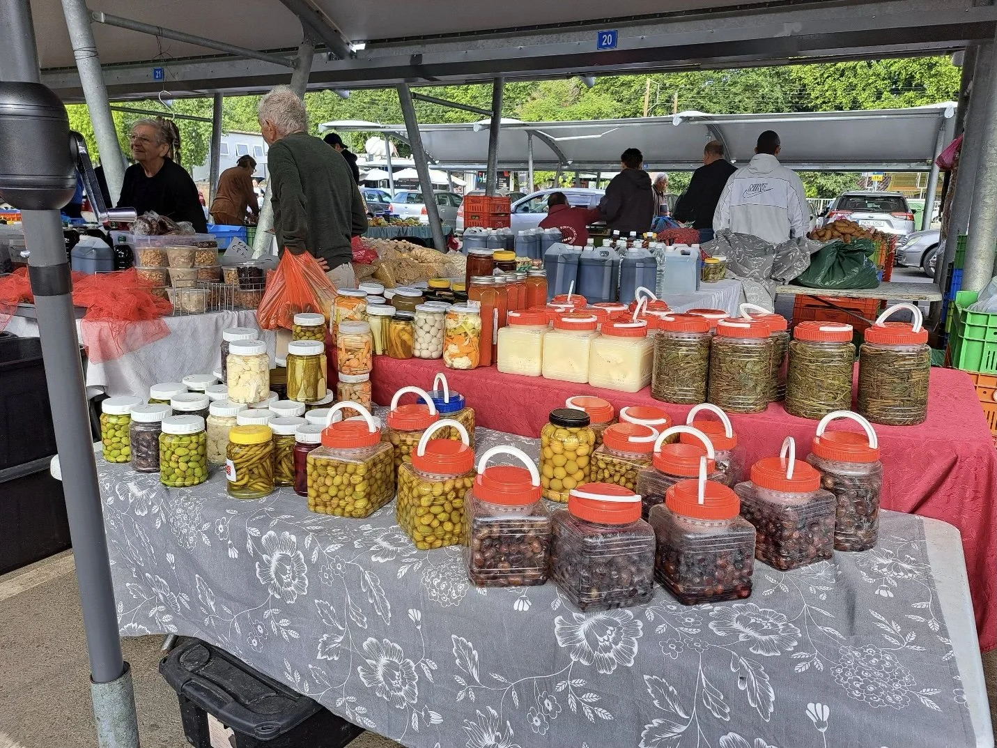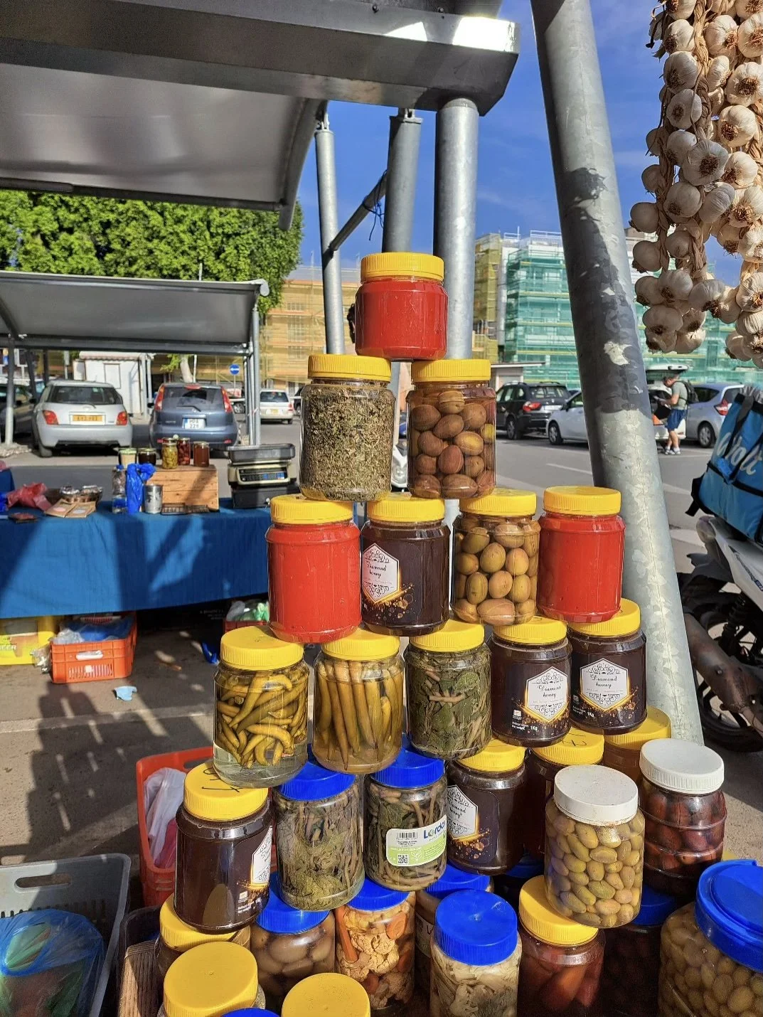 Olives, pickles, honey, chili peppers and fresh oregano displayed in fruit and vegetable open market in Nicosia.