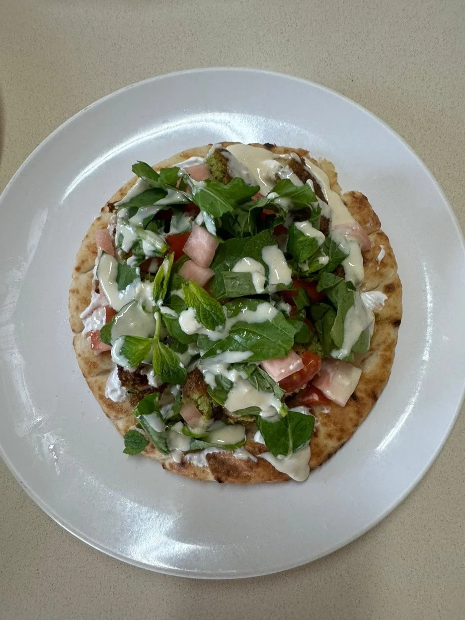 Homemade green falafel topped with vegetables and drizzled with tahini sauce